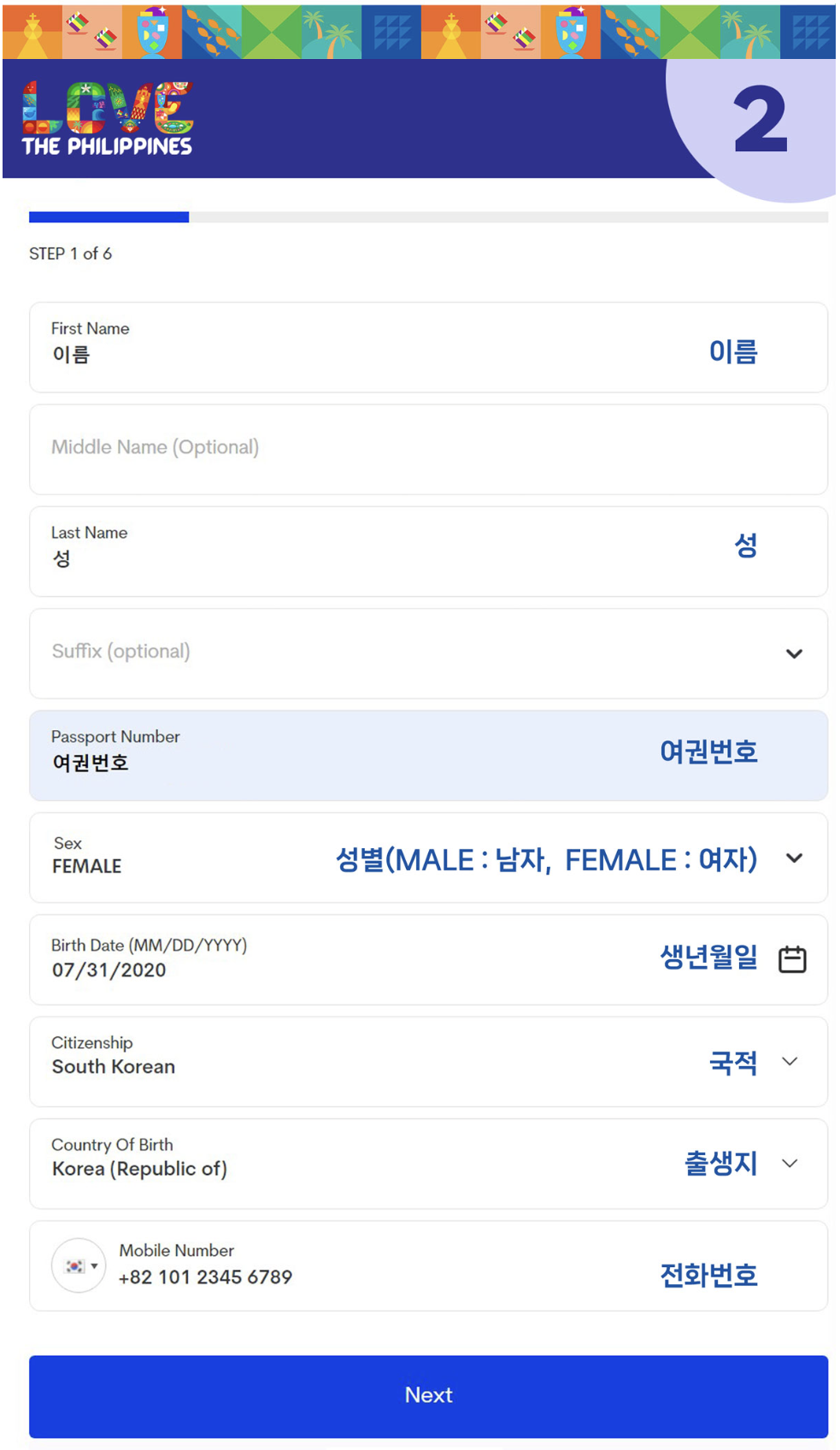 두 번째 화면에서는 여권에 있는 이름과 동일하게 영문 이름과 성을 입력합니다. 그리고 여권 번호와 국적을 사진과 같이 작성을 해줍니다.