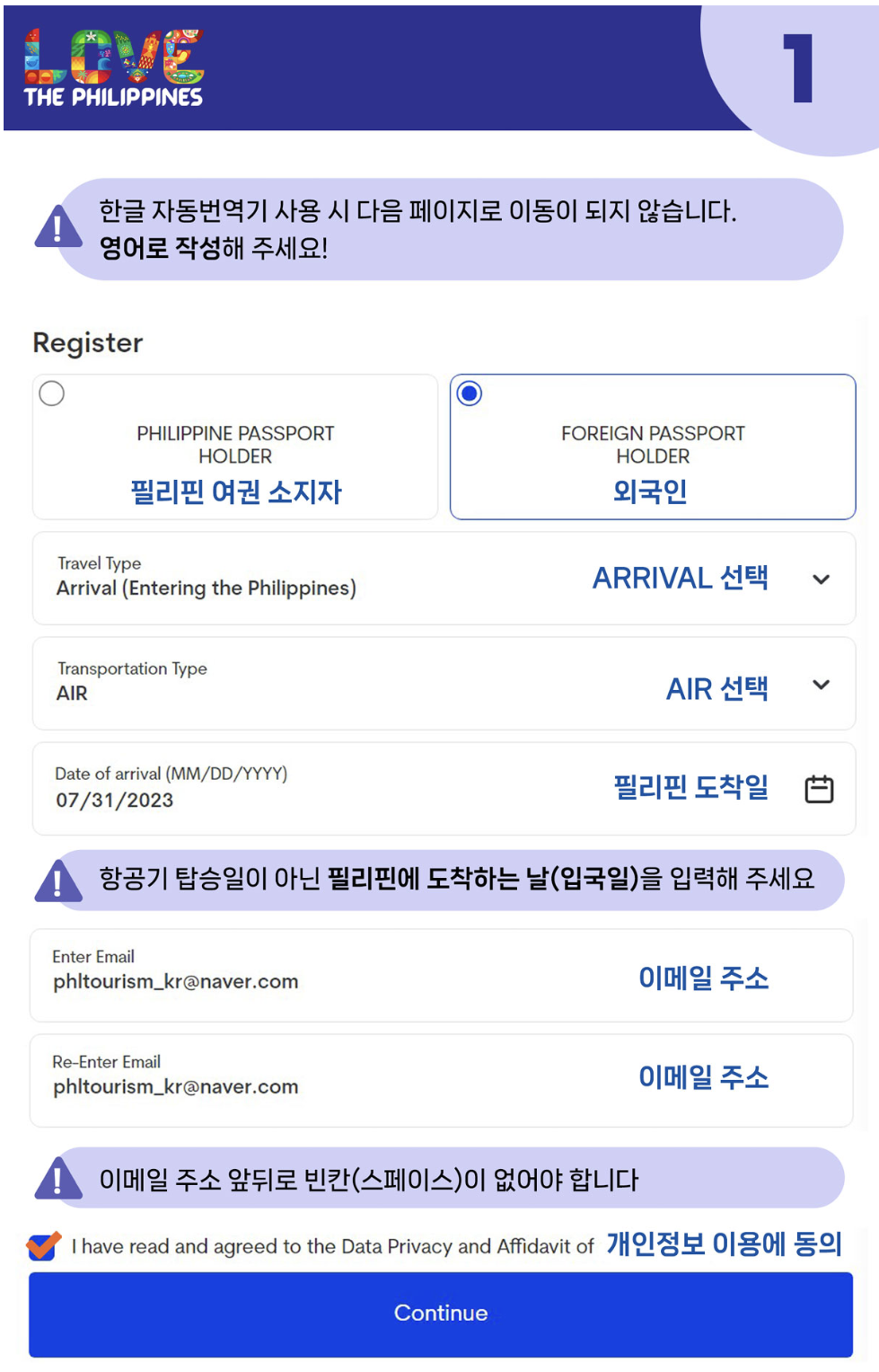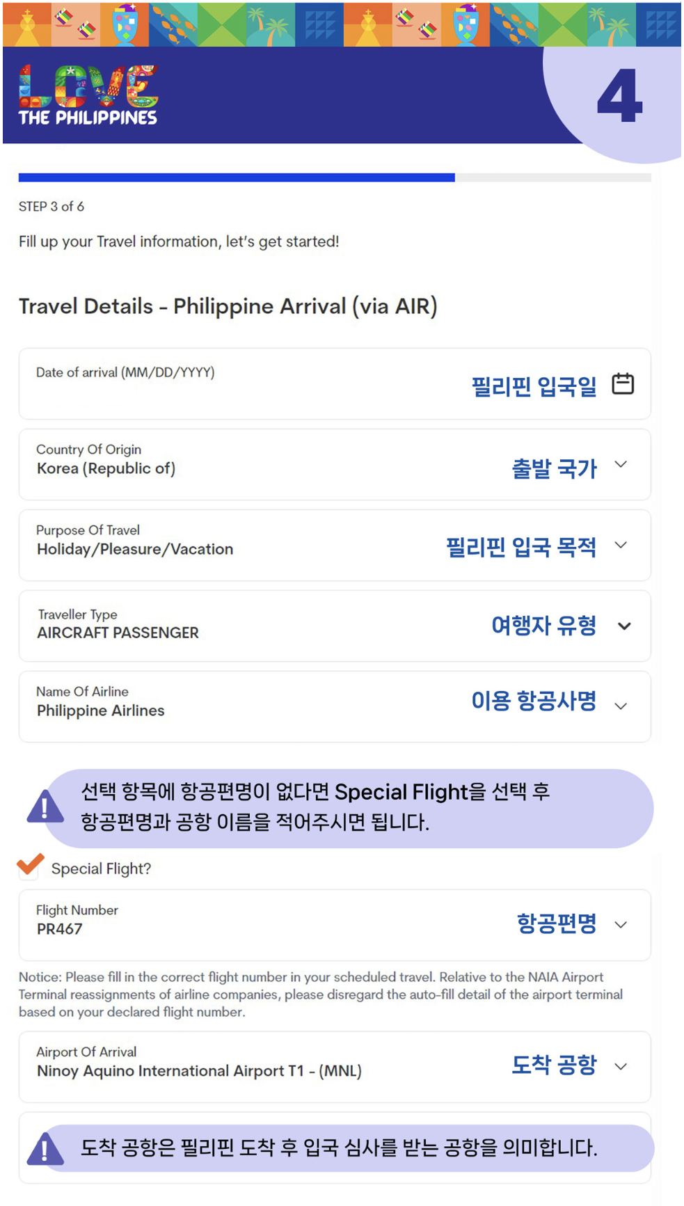 - Date of arrival : 필리핀에 출발하는 날짜가 아닌 필리핀에 도착하는 날짜를 입력합니다.