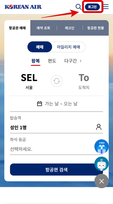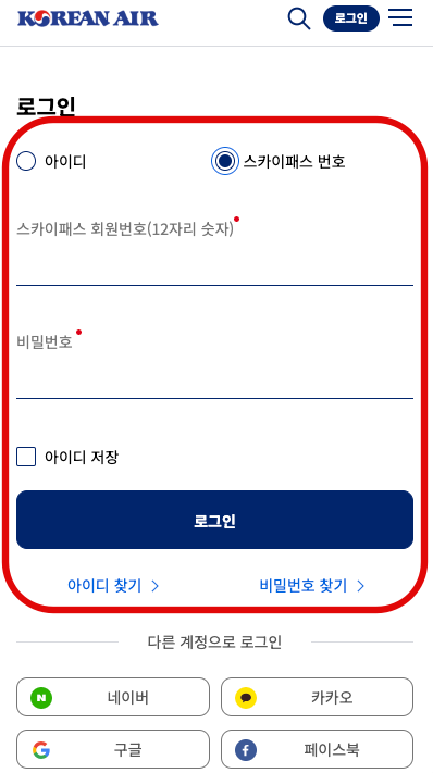 대한항공 어플로도 확인이 가능하지만 어플은 다운로드를 받아야 하기 때문에 대한항공 홈페이지를 기준으로 설명을 하도록 하겠습니다. 로그인을 하는 방법은 모바일과 PC 모두 동일합니다. 메인 화면의 제일 오른쪽 위를 보면 로그인 이라는 글씨가 있습니다. 이 로그인 버튼을 선택 한 뒤 나오는 다음 화면에서 아이디 혹은 스카이패스 번호와 비밀번호를 입력한 뒤 로그인을 해줍니다.