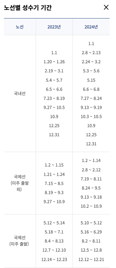 마일리지 공제표를 확인하는 곳에 가면 각 대양별로 필요한 마일리지와 노선별 성수기 기간을 확인 할 수 있습니다. 각 나라별로 성수기 기간이 다르기 때문에 꼭 확인하시고 마일리지를 사용하시길 바랍니다.
