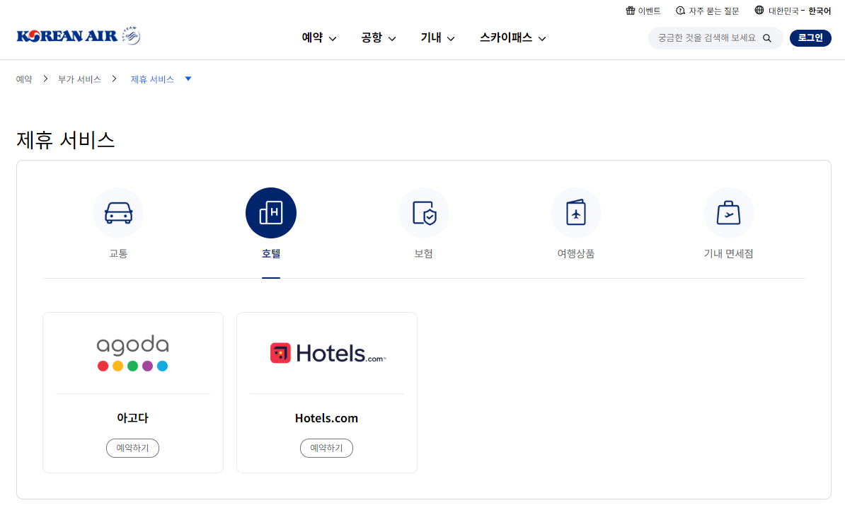 대한항공 제휴 서비스에는 교통, 호텔, 보험, 여행상품, 기내 면세점 등 다양한 것들이 있습니다. 여행을 가면 호텔 숙박은 무조건 예약을 해야 하기 때문에 대한항공 사이트를 통해서 아고다, 호텔스닷컴의 호텔을 예약하면 일정 금액에 따라 대한항공 마일리지가 적립이 됩니다.