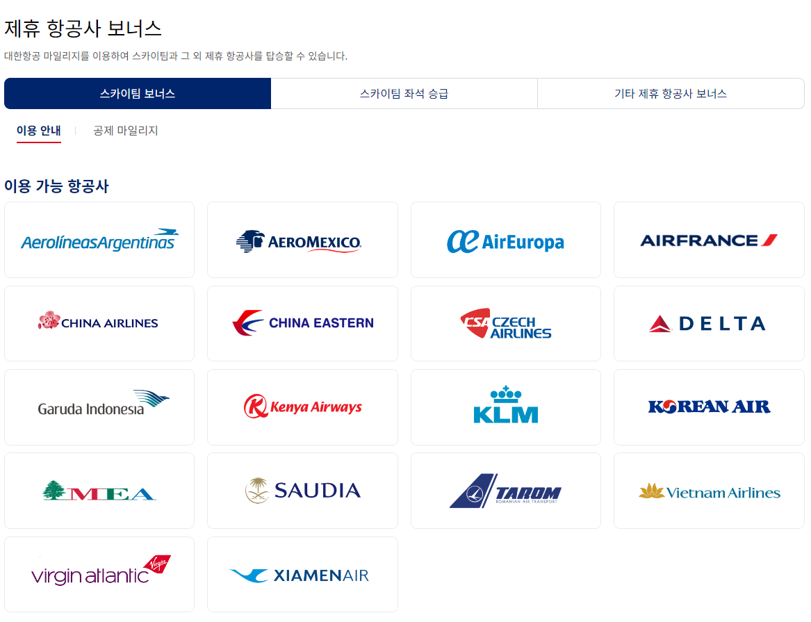 대한항공 외에 스카이팀 항공사를 이용해도 대한항공 마일리지를 적립하거나 사용 할 수 있습니다. 스카이팀 항공사는 아래 스크린샷을 통해 확인 할 수 있습니다.
