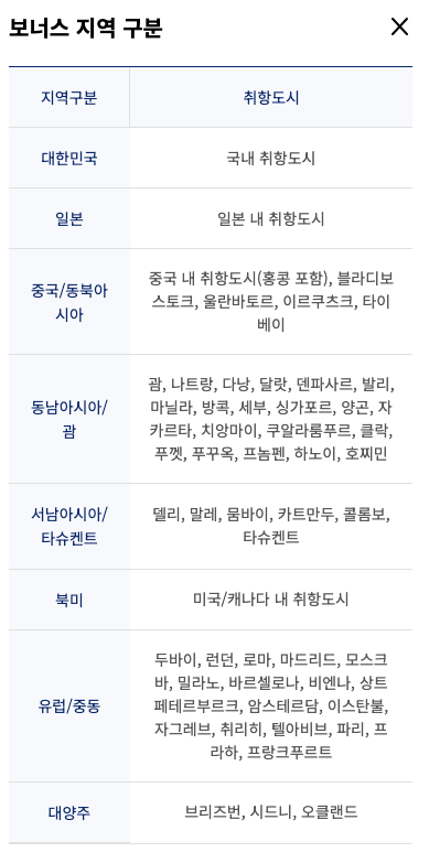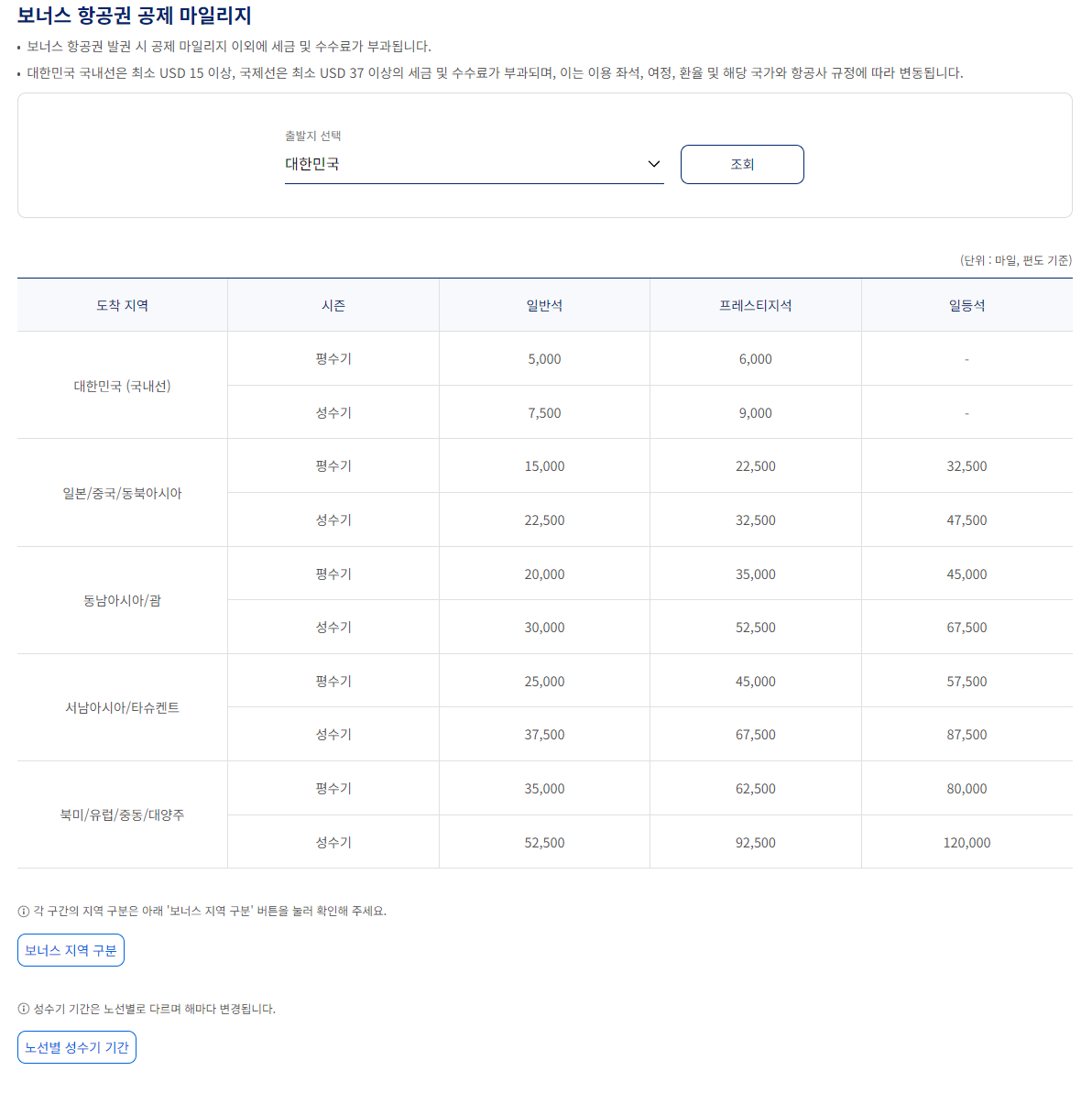 마일리지 공제표를 확인하는 곳에 가면 각 대양별로 필요한 마일리지와 노선별 성수기 기간을 확인 할 수 있습니다. 각 나라별로 성수기 기간이 다르기 때문에 꼭 확인하시고 마일리지를 사용하시길 바랍니다.