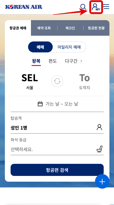 로그인을 하면 다시 대한항공 홈페이지의 처음 화면으로 돌아가게 됩니다. 이 화면에서는 처음과는 달리 로그인 버튼이 있던 자리에 MY라는 글씨의 버튼이 새롭게 생긴 것을 확인 할 수 있습니다. 이 버튼을 선택하면 다음 화면에서 지금 현재 내가 가지고 있는 마일리지를 확인 할 수 있습니다.