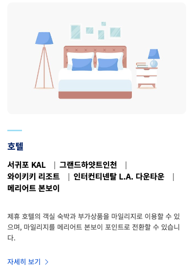 대한항공 제휴 서비스에는 교통, 호텔, 보험, 여행상품, 기내 면세점 등 다양한 것들이 있습니다. 여행을 가면 호텔 숙박은 무조건 예약을 해야 하기 때문에 대한항공 사이트를 통해서 아고다, 호텔스닷컴의 호텔을 예약하면 일정 금액에 따라 대한항공 마일리지가 적립이 됩니다.