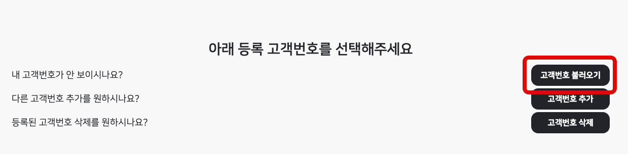 고객번호가 안보인다면 위와 같은 화면을 볼 수 있습니다. 여기서 고객번호 불러오기를 클릭하여 다음 화면으로 넘어갑니다.