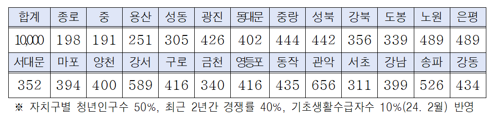 2024년 희망두배 청년통장 모집인원은 총 10,000명입니다. 아래 표는 자치구별로 청년인구수, 최근 2년간 경쟁률, 깇생활수급자수를 반영하여 나온 각 자치구별 모집 인원입니다.