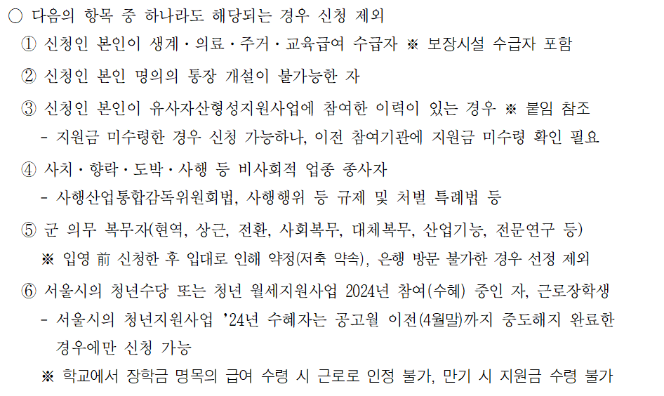 위 내용에서 신청 기준이 된다고 해도 아래 내용에 하나라도 해당이 된다면 희망두배 청년통장을 신청할 수 없습니다.