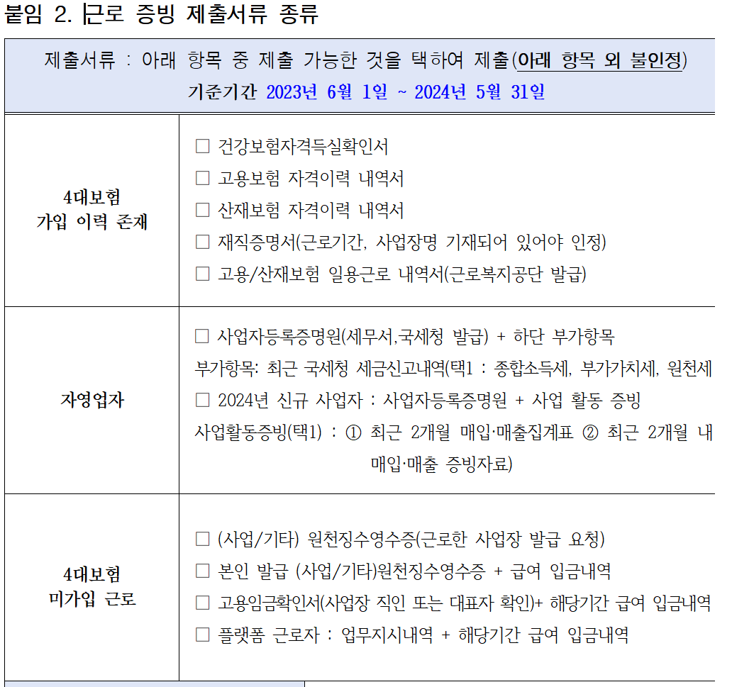 6번 근로 증빙 인증 서류는 아래와 같습니다. 본인에게 해당된는 근로 증빙 자료를 확인하셔서 발급받아 제출하시길 바랍니다.