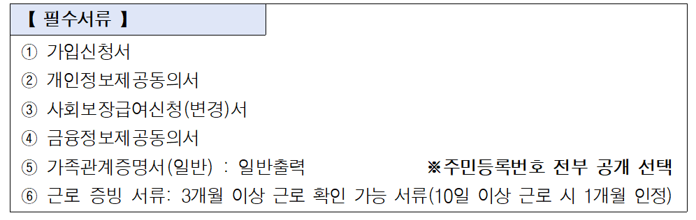 서울시 희망두배 청년통장을 신청하기 위해서는 6가지의 필수서류를 제출 해야 합니다. 가입신청서, 개인정보제공동의서, 사회보장급여신청(변경)서, 금융정보제공동의서, 가족관계증명서(일반) : 일반출력, 근로 증빙 서류