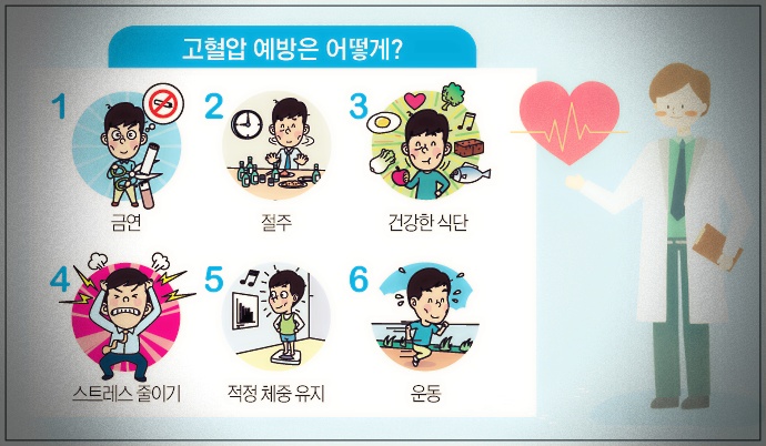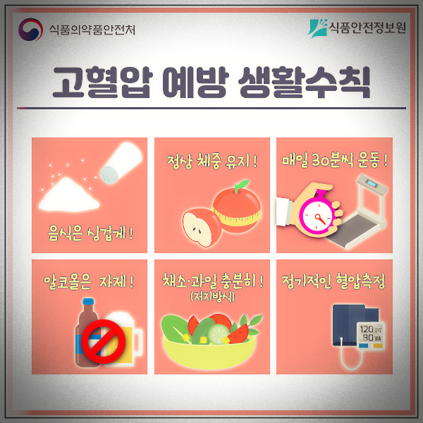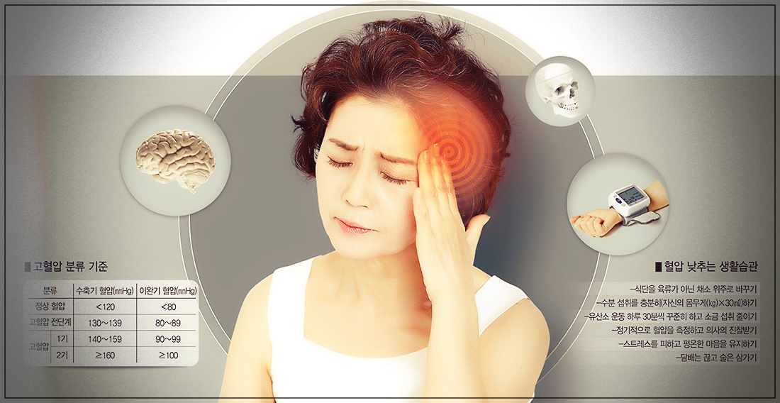 고혈압은 조용한 살인마로 서구화된 식습관과 불규칙한 생활로 현대 사람들에게 많이 발병되는 질병 입니다. 패스트푸드, 고기 등과 같은 나트륨이 많고 고열량 음식을 먹지 않는 식습관으로 건강한 삶으로 바꾸는 것이 고혈압에서 멀어지는 방법 중 하나입니다.